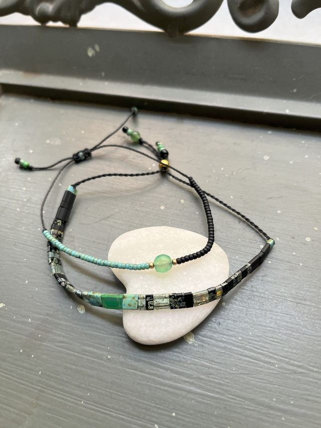 Vous trouverez également une autre version de l'ensemble deux bracelets noirs et verts en perles de rocailles plus grandes.