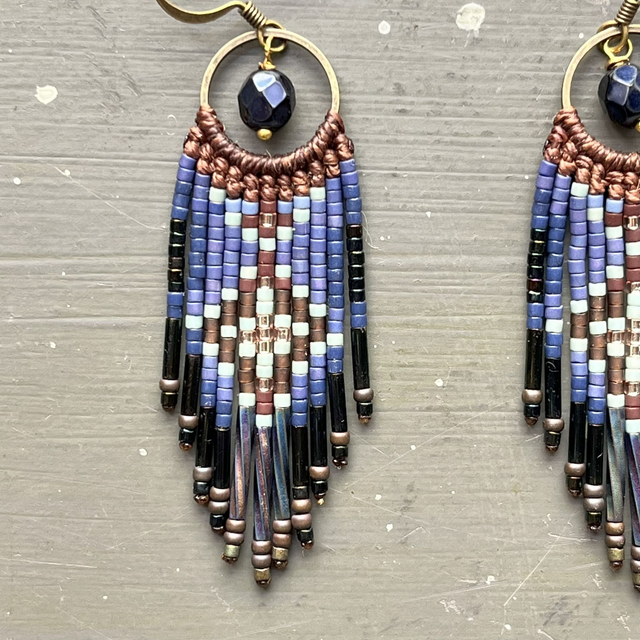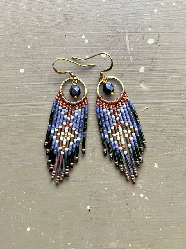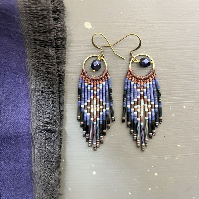 Grandes boucles d'oreille à franges bleue marine et marron en macramé et perles