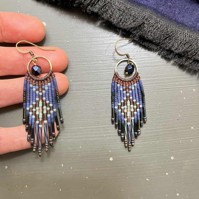 Boucles d'oreille à franges bleue marine et marron en macramé et perles, motif étoiles